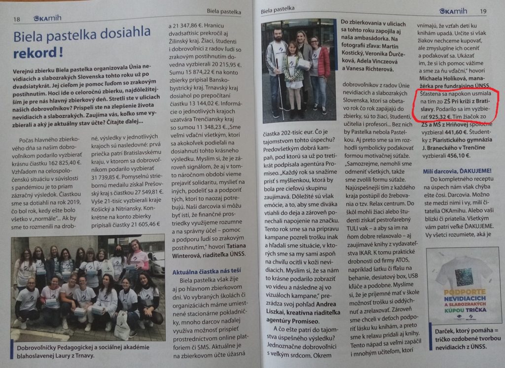 V septembri 2021 sa naša škola zapojila do verejnej zbierky Biela pastelka na podporu a pomoc nevidiacim a slabozrakým ľuďom. Podarilo sa nám vyzbierať úžasných 925,32 eur. Stali sme sa tak jedným z najúspešnejších tímov Bratislavského kraja, ktorý sa do zbierky zapojil. Dobrovoľnícky tím za našu školu vytvorili žiačky 9.B triedy Barbora Čavojová, Emily Nina Stone, Emma Nagyová a Alexandra Tóthová. Nedávno nás prišli navštíviť zástupcovia Únie slabozrakých a nevidiacich Slovenska a ocenili naše dobrovoľníčky TULI vakom, knihami a drobnými darčekmi. Zároveň vyslovili našej škole uznanie a poďakovanie za podporu zbierky. Touto cestou sa chceme poďakovať všetkým žiakom, rodičom, učiteľom i zamestnancom školy za zapojenie sa do Bielej pastelky. Sme veľmi radi, že naša škola môže byť vďaka ochote a spolupatričnosti súčasťou projektu, ktorý pomáha a uľahčuje život handicapovaným ľuďom. Ďakujeme.