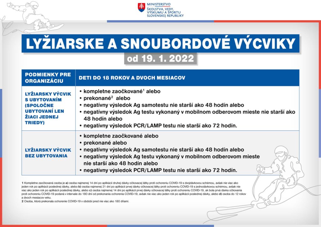 Ministerstvo školstva zverejnilo aj dokumenty upravujúce organizáciu lyžiarskych a snoubordových výcvikov pre školy platné od 19.1.2022. Ubytovanie pre lyžiarske a snoubordové výcviky je od 19.1.2022 povolené v režime OTP.