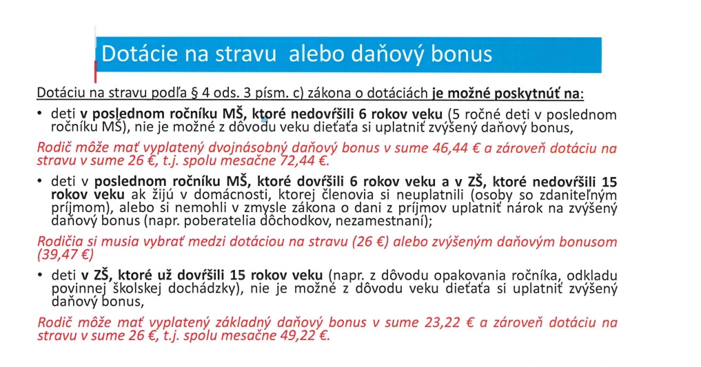 Vážení rodičia, od nového školského roka sa mení systém dotácií na stravu a rodič si vyberá, či si chce uplatniť daňový bonus alebo dotáciu na stravu.